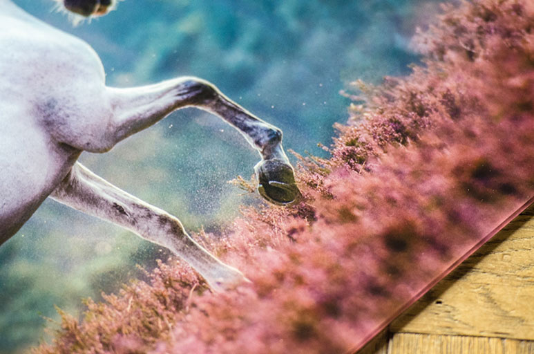 Kijkend naar de afdruk zelf hebben ze de subtiele details, zoals het zand bij de hoeven, erg mooi weten af te drukken. Ook zijn de kleuren afgedrukt zoals aangeleverd. Het contrast tussen de bloeiende roze heide en de koele blauwe kleuren van de achtergrond komt goed uit de verf.